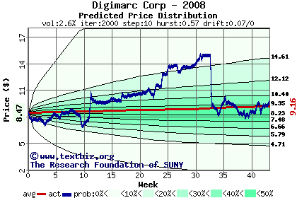 The high to date and low to date prices of the stock plotted against a random walk model for 2008 (what's this?).