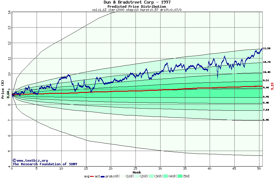 The following graph plots the year-to-date performance of the stock for 1997 compared to the probability calculated by a random walk model.