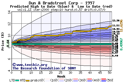 The high to date and low to date prices of the stock plotted against a random walk model for 1997 (what's this?).