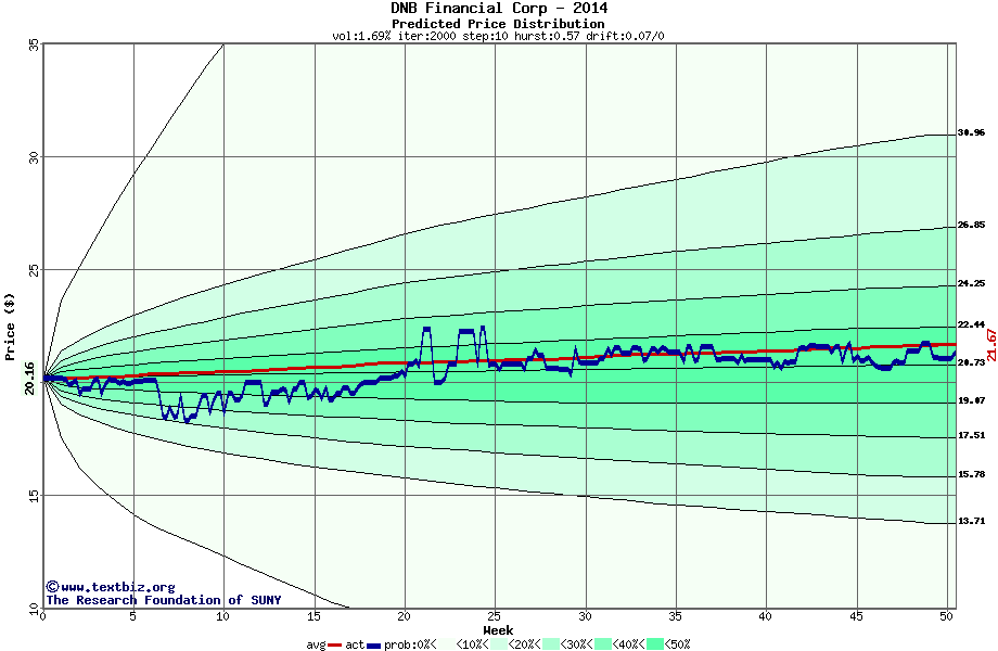 The following graph plots the year-to-date performance of the stock for 2014 compared to the probability calculated by a random walk model.