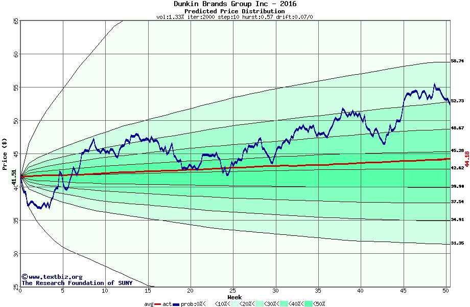 The high to date and low to date prices of the stock plotted against a random walk model for 2016 (what's this?).