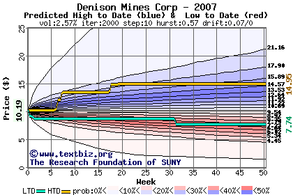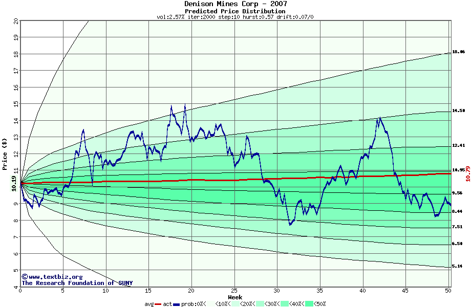 The high to date and low to date prices of the stock plotted against a random walk model for 2007 (what's this?).