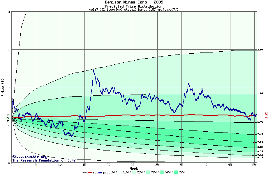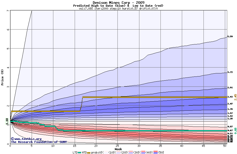 The high to date and low to date prices of the stock plotted against a random walk model for 2009 (what's this?).
