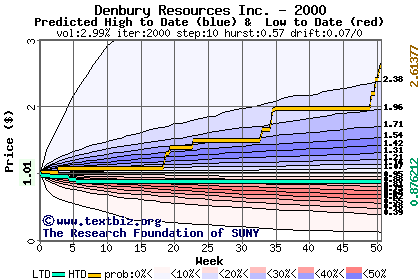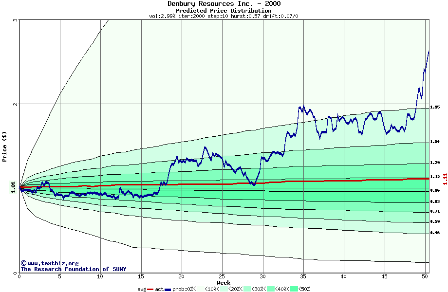 The high to date and low to date prices of the stock plotted against a random walk model for 2000 (what's this?).