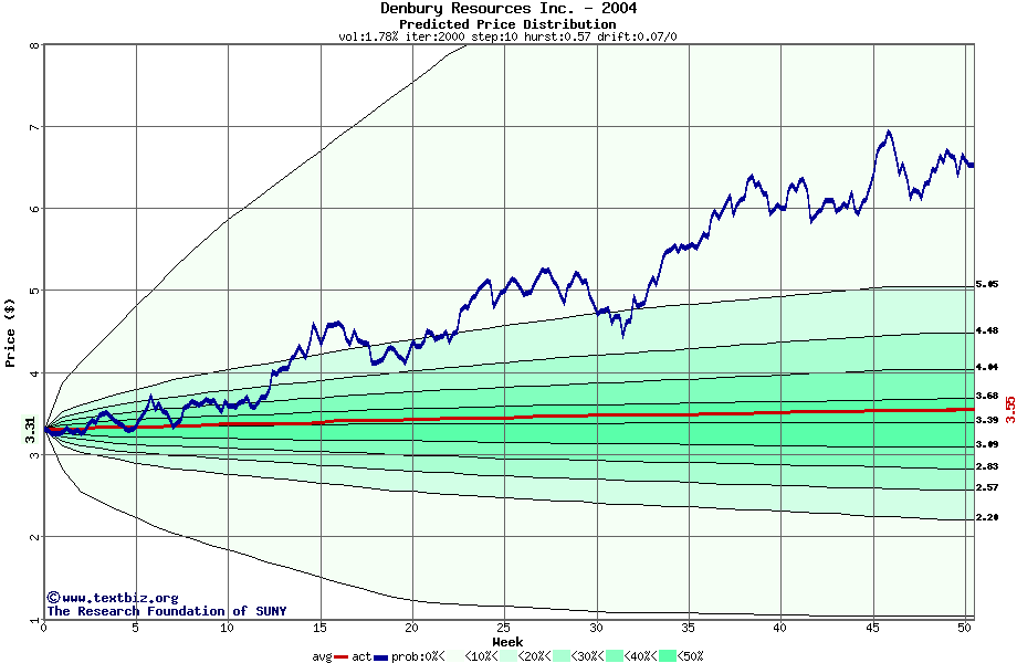 The high to date and low to date prices of the stock plotted against a random walk model for 2004 (what's this?).