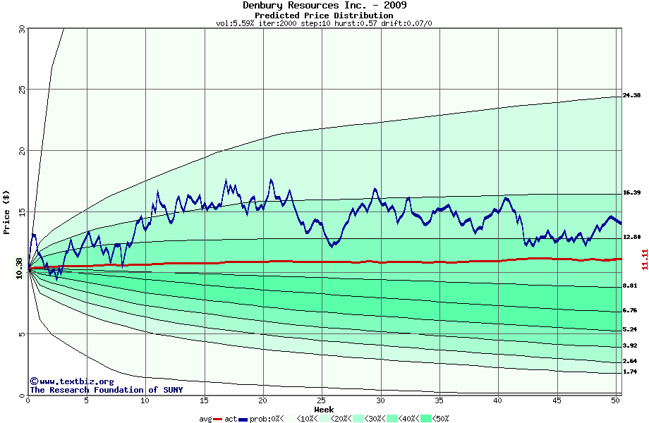 The following graph plots the year-to-date performance of the stock for 2009 compared to the probability calculated by a random walk model.