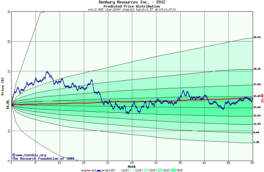 The following graph plots the year-to-date performance of the stock for 2012 compared to the probability calculated by a random walk model.