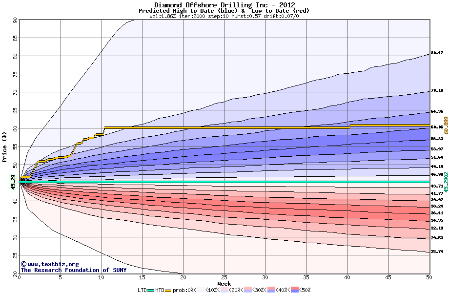 The high to date and low to date prices of the stock plotted against a random walk model for 2012 (what's this?).