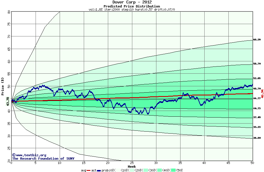 The following graph plots the year-to-date performance of the stock for 2012 compared to the probability calculated by a random walk model.