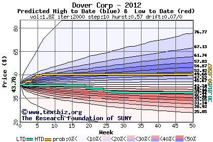 The high to date and low to date prices of the stock plotted against a random walk model for 2012 (what's this?).