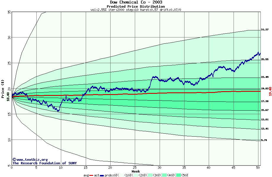 The following graph plots the year-to-date performance of the stock for 2003 compared to the probability calculated by a random walk model.