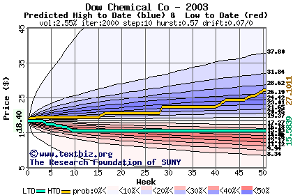 The high to date and low to date prices of the stock plotted against a random walk model for 2003 (what's this?).