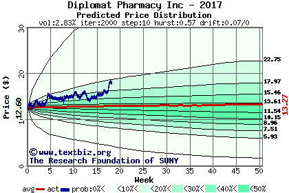 The high to date and low to date prices of the stock plotted against a random walk model for 2017 (what's this?).