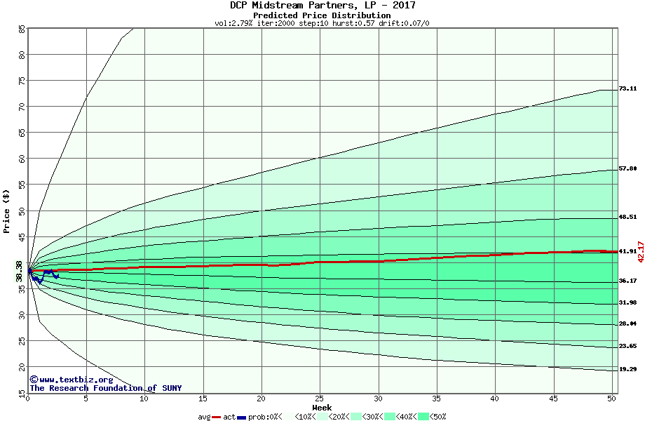 The high to date and low to date prices of the stock plotted against a random walk model for 2017 (what's this?).