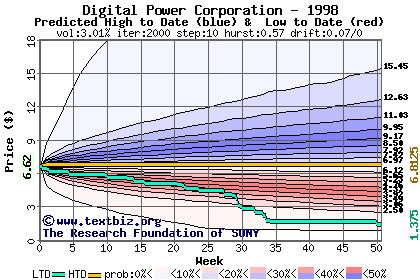 The high to date and low to date prices of the stock plotted against a random walk model for 1998 (what's this?).