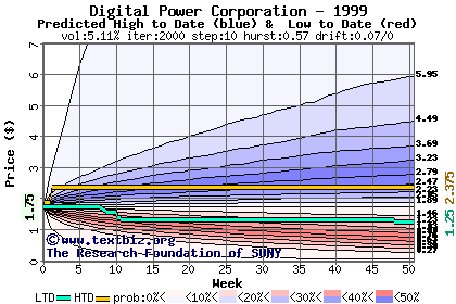 The high to date and low to date prices of the stock plotted against a random walk model for 1999 (what's this?).