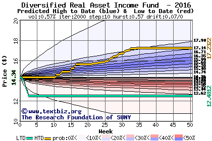The high to date and low to date prices of the stock plotted against a random walk model for 2016 (what's this?).