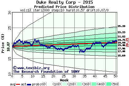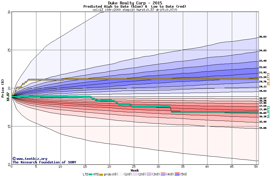 The following graph plots the year-to-date performance of the stock for 2015 compared to the probability calculated by a random walk model.