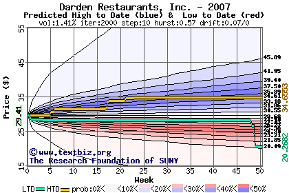 The high to date and low to date prices of the stock plotted against a random walk model for 2007 (what's this?).