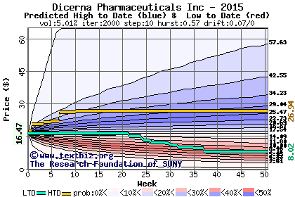 The high to date and low to date prices of the stock plotted against a random walk model for 2015 (what's this?).