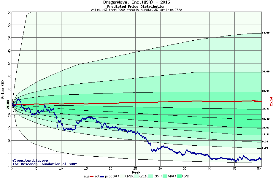 The following graph plots the year-to-date performance of the stock for 2015 compared to the probability calculated by a random walk model.