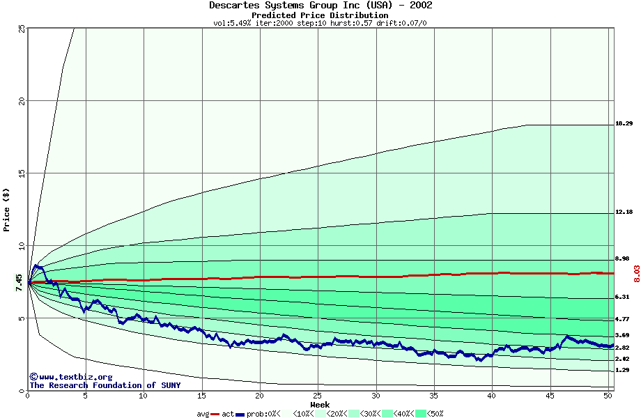 The following graph plots the year-to-date performance of the stock for 2002 compared to the probability calculated by a random walk model.