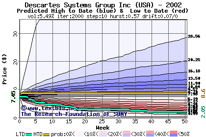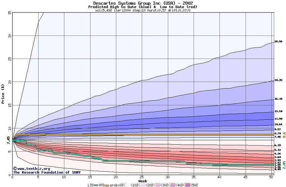 The high to date and low to date prices of the stock plotted against a random walk model for 2002 (what's this?).