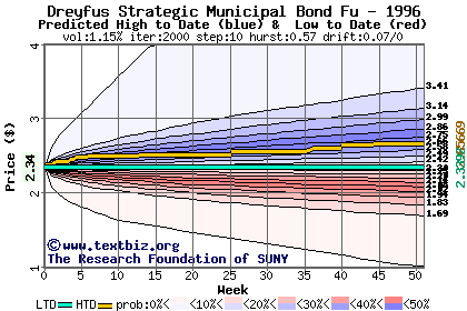 The high to date and low to date prices of the stock plotted against a random walk model for 1996 (what's this?).