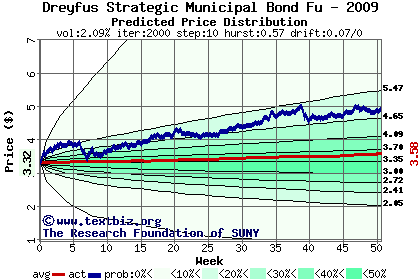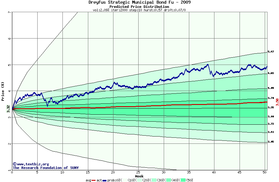The high to date and low to date prices of the stock plotted against a random walk model for 2009 (what's this?).