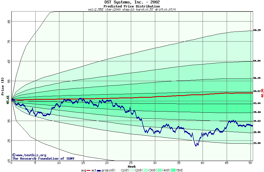 The following graph plots the year-to-date performance of the stock for 2002 compared to the probability calculated by a random walk model.