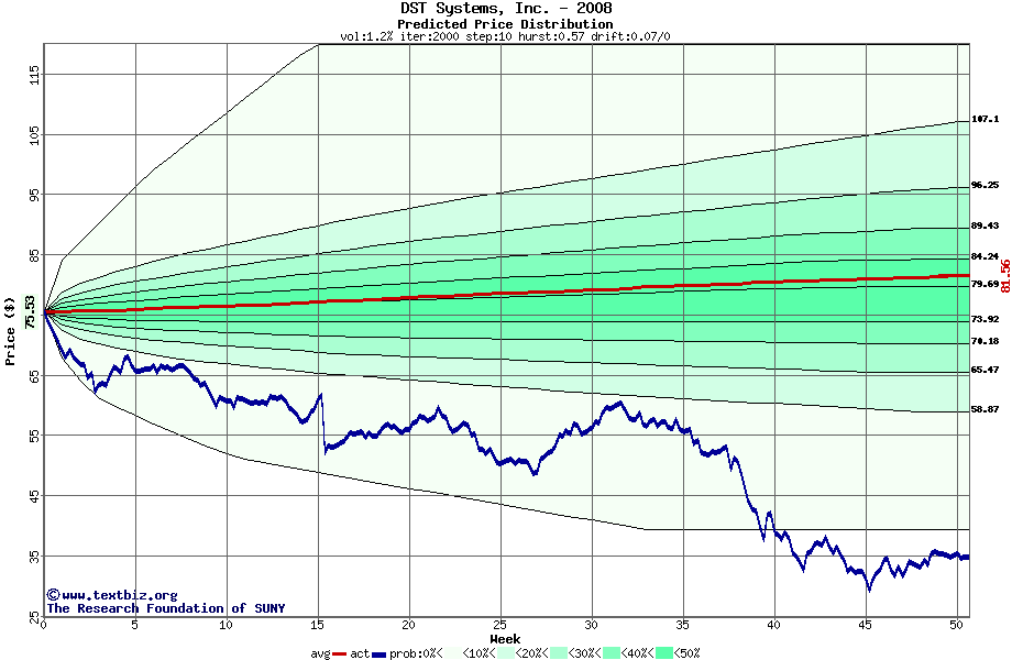 The following graph plots the year-to-date performance of the stock for 2008 compared to the probability calculated by a random walk model.