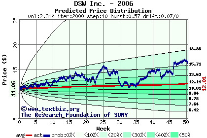 The following graph plots the year-to-date performance of the stock for 2006 compared to the probability calculated by a random walk model.