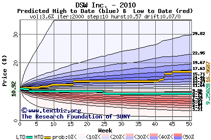 The high to date and low to date prices of the stock plotted against a random walk model for 2010 (what's this?).
