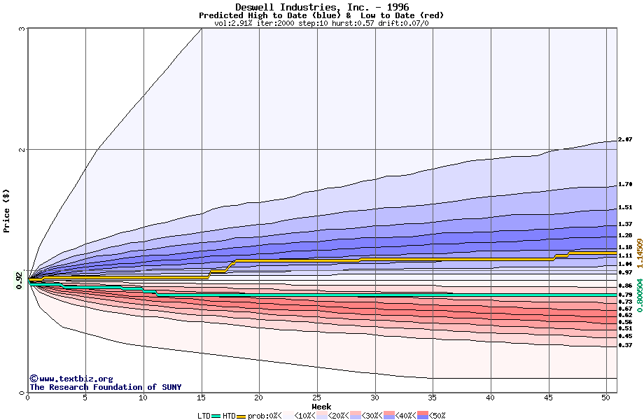 The high to date and low to date prices of the stock plotted against a random walk model for 1996 (what's this?).