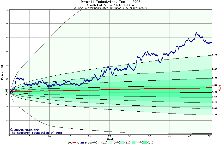 The following graph plots the year-to-date performance of the stock for 2003 compared to the probability calculated by a random walk model.