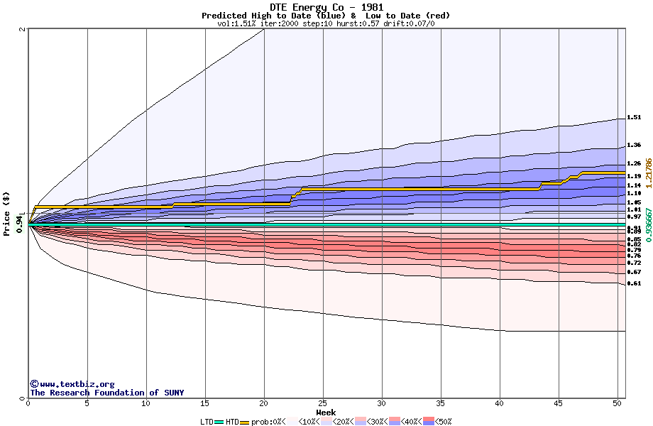 The high to date and low to date prices of the stock plotted against a random walk model for 1981 (what's this?).