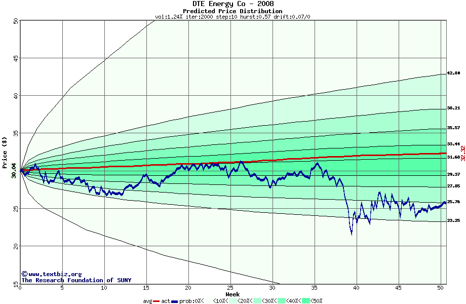 The following graph plots the year-to-date performance of the stock for 2008 compared to the probability calculated by a random walk model.
