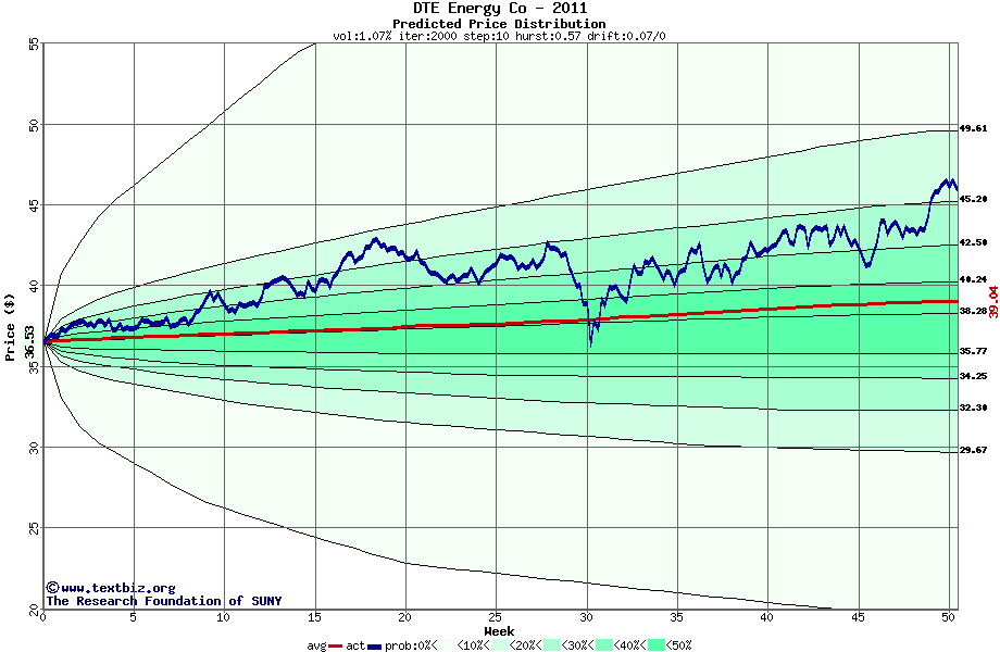 The following graph plots the year-to-date performance of the stock for 2011 compared to the probability calculated by a random walk model.