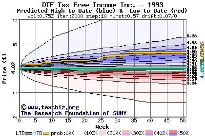 The high to date and low to date prices of the stock plotted against a random walk model for 1993 (what's this?).