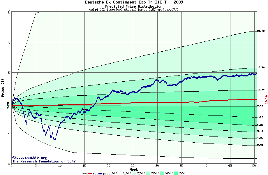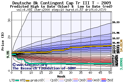The high to date and low to date prices of the stock plotted against a random walk model for 2009 (what's this?).