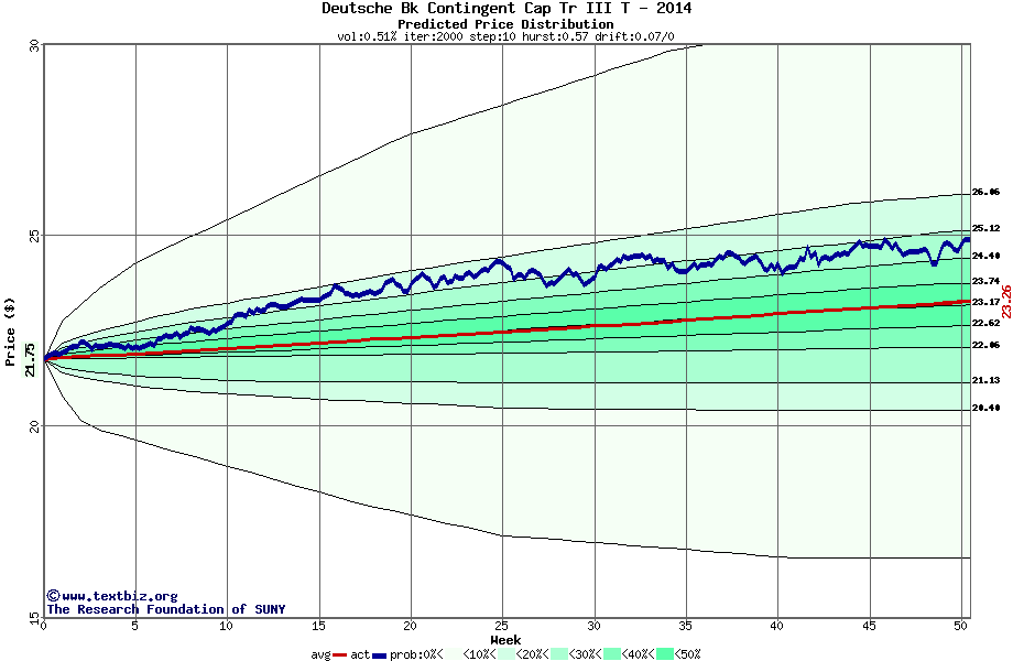 The following graph plots the year-to-date performance of the stock for 2014 compared to the probability calculated by a random walk model.