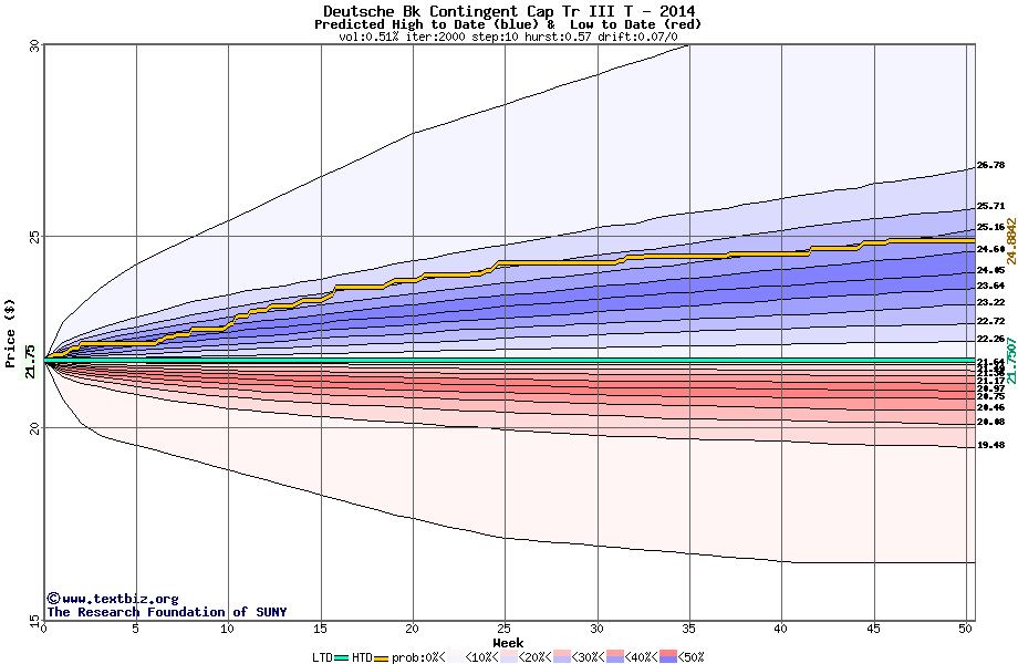 The high to date and low to date prices of the stock plotted against a random walk model for 2014 (what's this?).