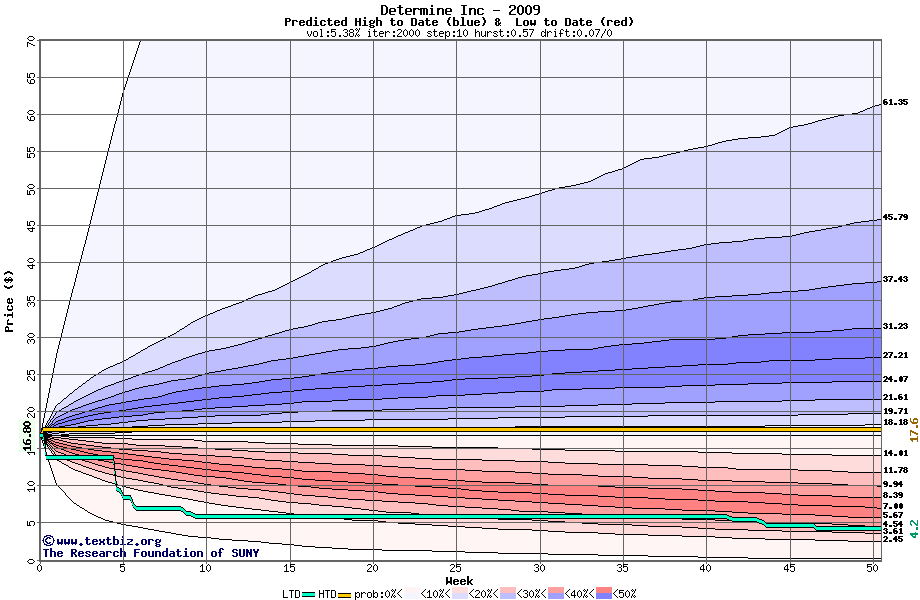 The following graph plots the year-to-date performance of the stock for 2009 compared to the probability calculated by a random walk model.
