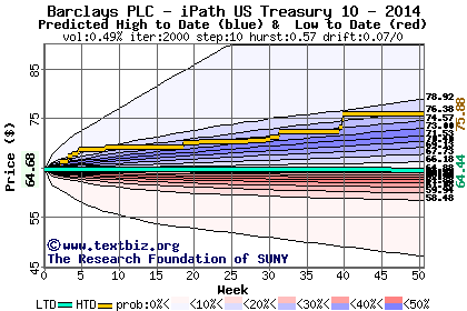 The following graph plots the year-to-date performance of the stock for 2014 compared to the probability calculated by a random walk model.