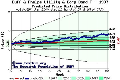 The high to date and low to date prices of the stock plotted against a random walk model for 1997 (what's this?).