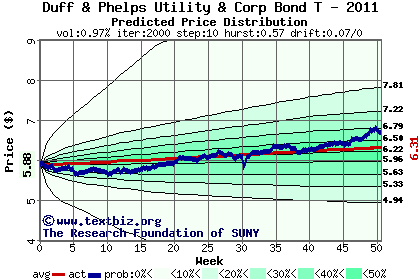 The high to date and low to date prices of the stock plotted against a random walk model for 2011 (what's this?).