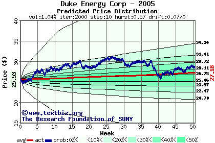 The following graph plots the year-to-date performance of the stock for 2005 compared to the probability calculated by a random walk model.