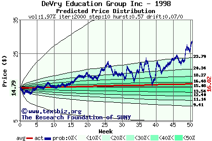 The high to date and low to date prices of the stock plotted against a random walk model for 1998 (what's this?).