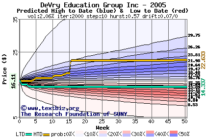 The high to date and low to date prices of the stock plotted against a random walk model for 2005 (what's this?).