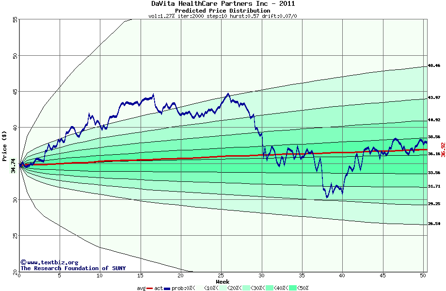The high to date and low to date prices of the stock plotted against a random walk model for 2011 (what's this?).